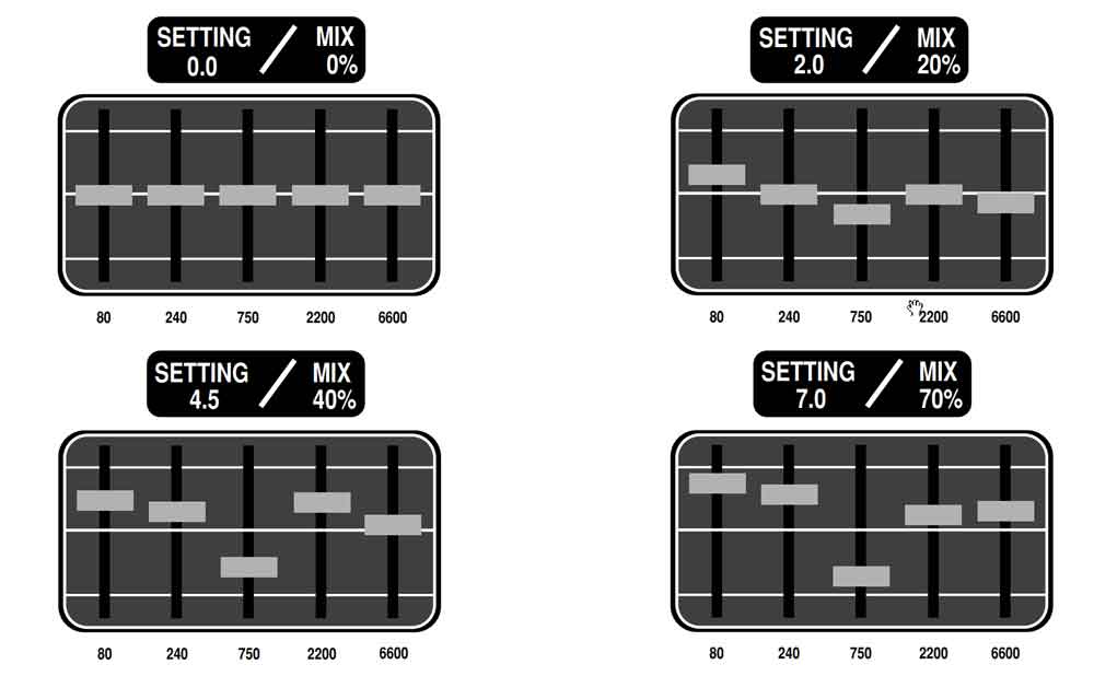 As you can see, you have 2 Lead Drives, and these correspond to the different modes that the unit offers. So when you are on one of the e.g. Lead 1 modes, only Lead Drive 1 can be used. In this case, adjusting Lead Drive 2 won’t do anything to your sound. Apart from standard controls, you may have already noticed there’s also a control named Dynamic Voice. Dynamic Voice is a unique feature of the TriAxis. It’s designed to include Boogie’s famous 5-band EQ with slight differences. It not only acts as a graphic EQ but also as a blend of dry and EQ’ed signals at the same time. The higher you set it, the higher the dry/wet signal gets as well. When it’s set at 10, the whole signal is passed through the Dynamic Voice. To understand how these Dynamic Voice values refer to specific 5-band graphic EQ curves, please have a look at the image below (taken from the manual).