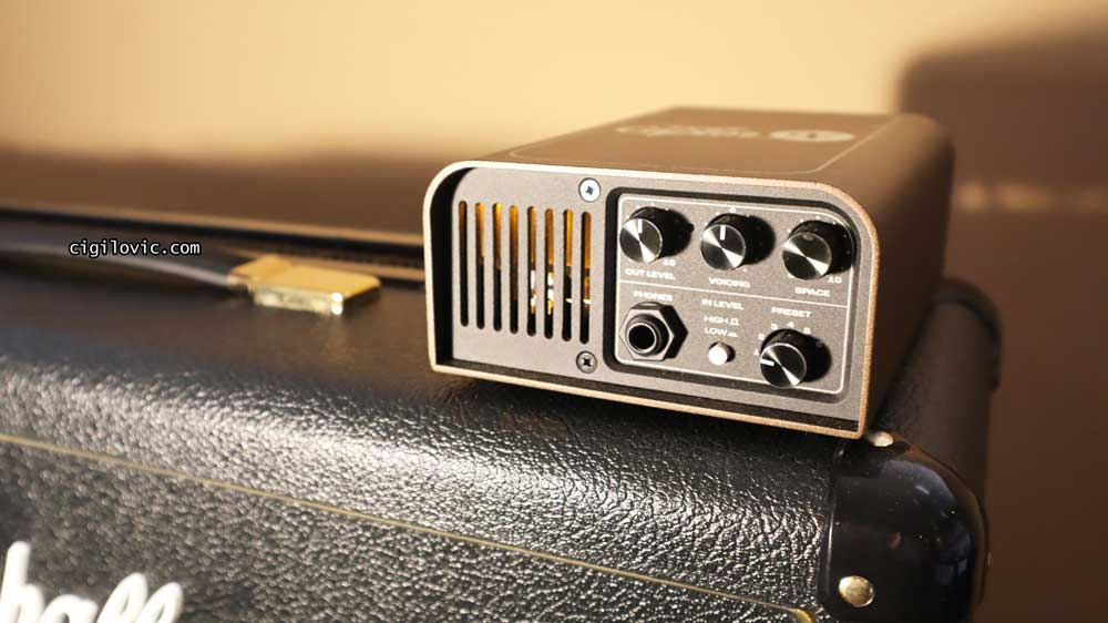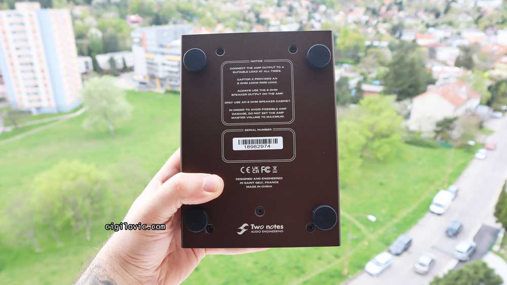 Just for additional information, here’s an image of the bottom chassis. There’s some information printed there, as well as the serial number. Four thick pads come installed with Captor X. The only problem with these pads is that they were not fully levelled. So my Captor X was rocking very slightly when touched on a surface. Of course, this is not an issue, but just additional information for you. Most of the time, you will just place the unit next to your tube amp or somewhere on your desk, and you will never touch the unit again!