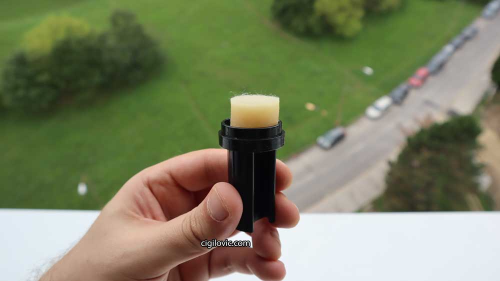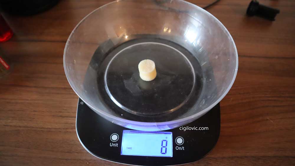 Next, I tried so hard to squeeze this hard material and remove as much white mineral oil as I could. Basically, you can only extract a couple of drops. Not more than that! This kitchen scale is pretty accurate, and it didn’t even move a tick! And don’t think that there’s a container or a small tank behind the black holder that feeds your rubbing needs with extra virgin white mineral oil. It’s just a small part of the whole product