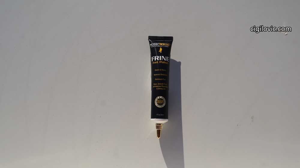 Using Frine is pretty straightforward; however, you should be careful with the amount you are going to apply. At first, I tend to use a generous amount on the polishing cloth; however, it immediately spreads on the MusicNomad Fretboard Guard and lands on the fingerboard. As you can also see in the official Music Nomad video, only a tiny little bit of Frine is enough for a couple of frets already.